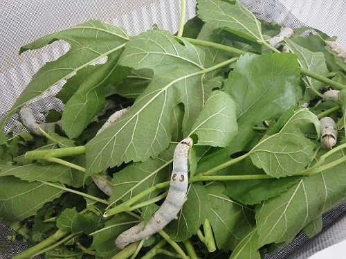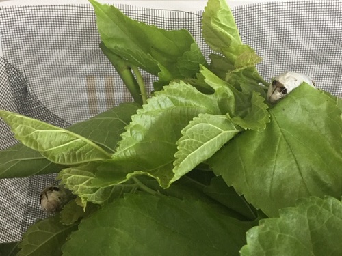 持ち帰った桑の葉の量に限りがあるため、足りなくなるのではと心配する職員を横目に、蚕たちはこの日もモリモリと桑の葉を頬張っていました。
