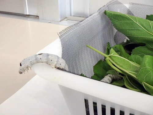 月曜日は資料館が休館日のため、日曜日の夜から蚕たちは資料館職員宅へ一時お引越しをしました。