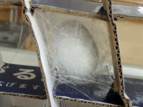 10匹中9匹が繭(まゆ)を作りましたが、残りの1匹は繭を作ることができませんでした。9個の繭は中身が見えないくらいしっかりとした厚みになっていました。