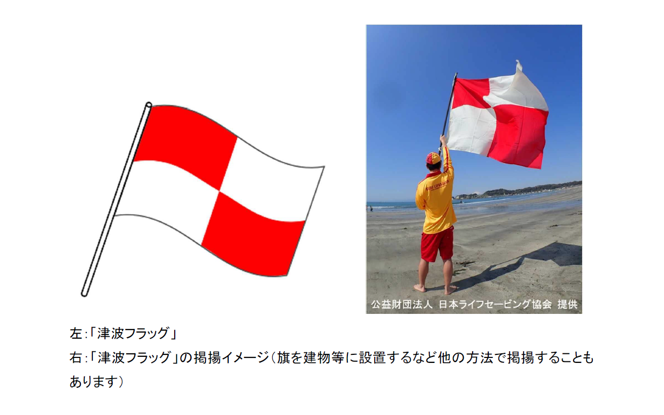 海水浴場等で「津波フラッグ」を見かけたら、速やかに避難を開始してください。