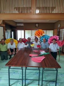 室根神社祭「マツリバ行事」袰先陣の始まりや袰先陣保存会の立ち上げた経緯、今後の展望などについて懇談し、曲ろくの花を作製しました。