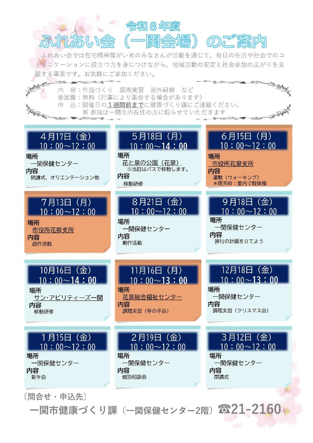 ふれあい会(一関会場) コンテンツ番号:4240 更新日:2026年4月1日 印刷 大きな字で印刷 開催日時 令和8年5月18日(月)10時~14時 場所 花と泉の公園 ほか 主な内容 精神障がい者の社会参加支援事業 地域におけるステップアップの場 受付・申し込み ・実費負担有り ・申込必要 5月11日までに健康づくり課へ申込みください 日程表 ふれあい会(一関会場)日程表 このページに関するお問い合わせ 健康こども部 健康づくり課 〒021-0026 岩手県一関市山目前田13番地1 電話番号:0191-21-2160 FAX番号:0191-21-4656 メールでのお問い合わせ 前のページへ戻る ホームに戻る