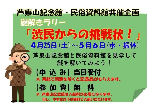 ゴールデンウィークのお楽しみイベントとして、謎解きラリー「渋民からの挑戦状!」を開催します。