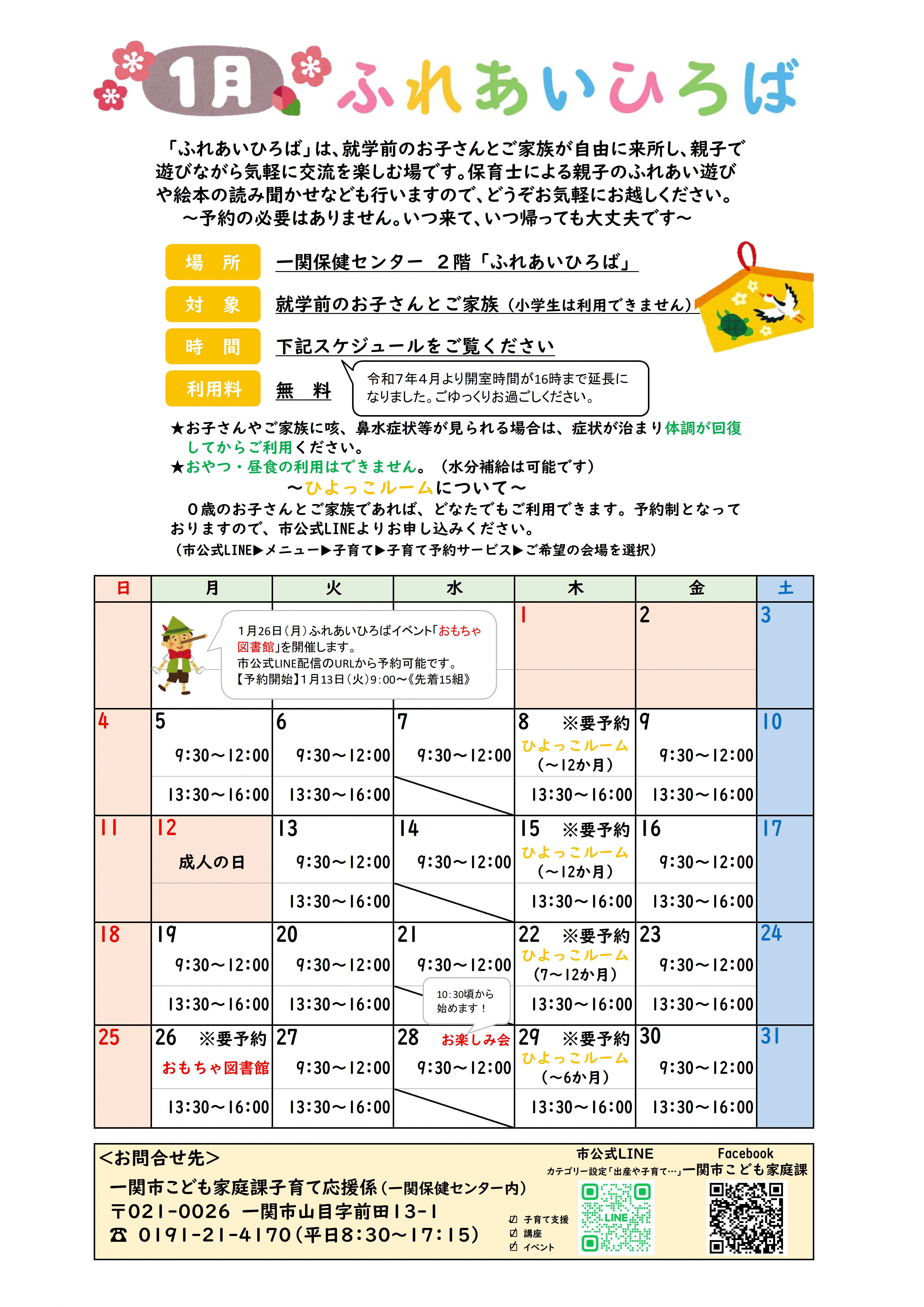 一関地域「おやこ広場」(NPO法人いちのせき子育てネット)電話0191-26-6401千厩地域「おやこ広場"てって"」電話0191-48-5781