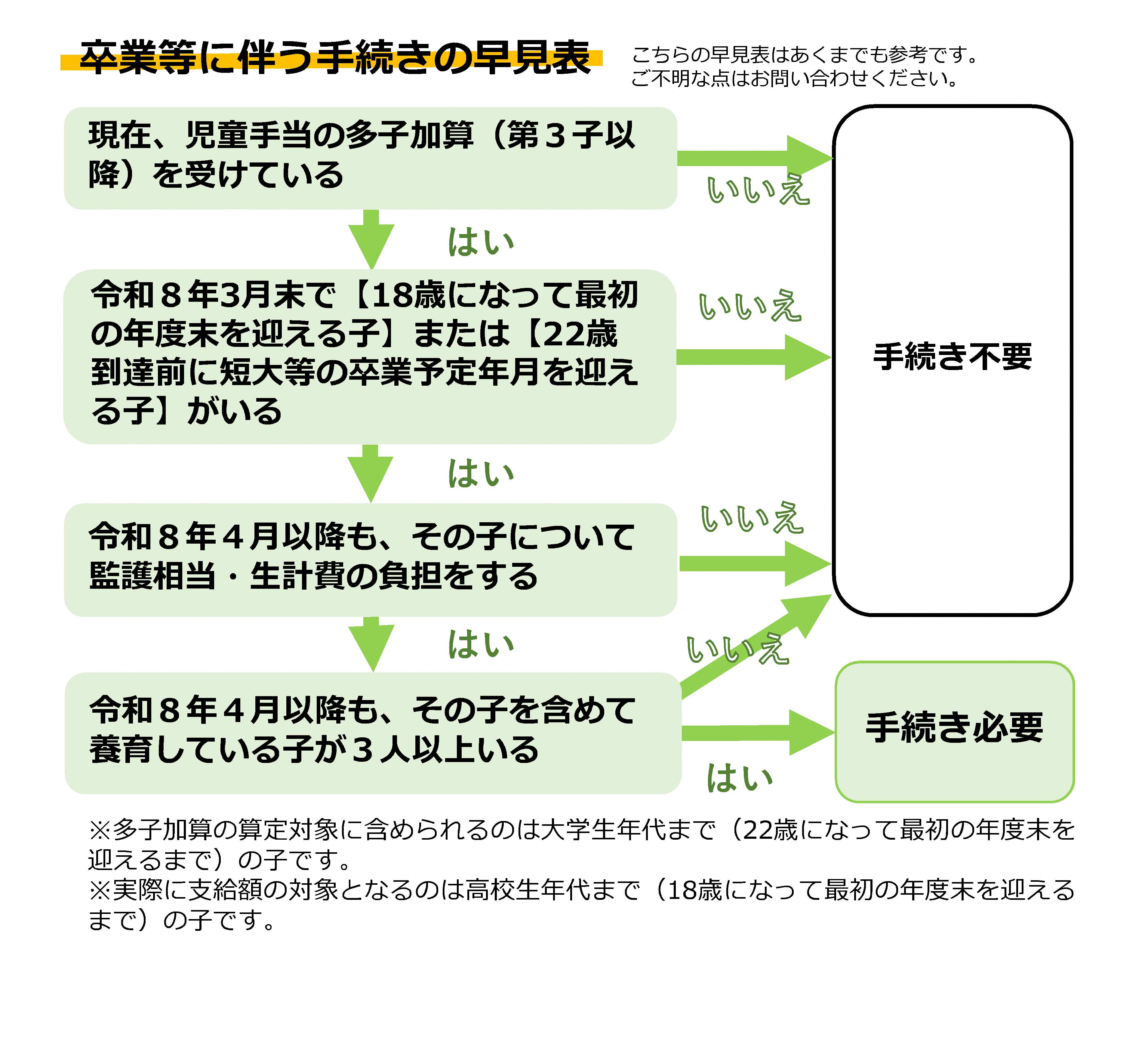児童手当の多子加算(第3子以降)を受けている方で、多子加算の対象となっている子が以下に該当する場合、その子を令和8年4月以降も引き続き多子加算の対象とするためには申請が必要です。
