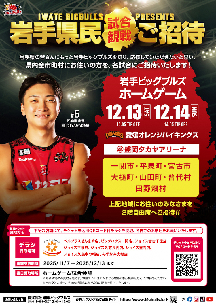 プロバスケットボールチーム「岩手ビッグブルズ」から一関市民の皆さんを無料招待するホームゲームの案内が届きました。