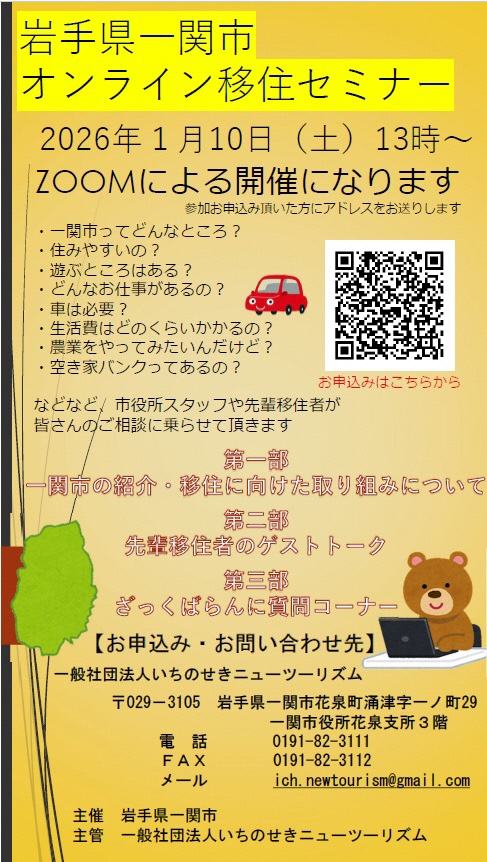市では、市外在住者に対し、本市の魅力や移住定住の支援策などを紹介し、また、先輩移住者や地域づくり活動に取組む市民や団体との交流機会を提供することにより、一関市のファンを拡大するとともに、本市への移住・定住の促進を図るため、オンライン移住相談会を開催します。
