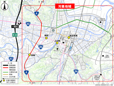 一関市中心部には主要渋滞箇所が4箇所存在しており、通勤時を始めとした渋滞が発生しています。特に7:45~8:15の間は市内の主要道路の速度低下が顕著であり、通勤時間も長くなります。