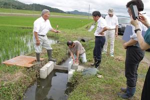門崎メダカ米を生産しているほ場内で米の作付方法やメダカの保護の方法などについて伺った後、川崎農村研修センターに移動し、メダカを保護するに至った経緯や保護するうえでの苦労、ブランド米としての販売のきっかけ、今後の展望などについて懇談しました。