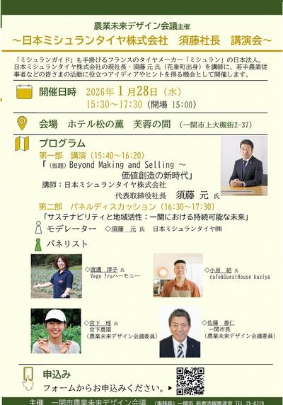 「ミシュランガイド」も手掛けるフランスのタイヤメーカー「ミシュラン」の日本法人、日本ミシュランタイヤ株式会社の現社長・須藤 元 氏(花泉町出身)を講師に、若手農業従事者などの皆さまの活動に役立つアイディアやヒントを得る機会として開催します。