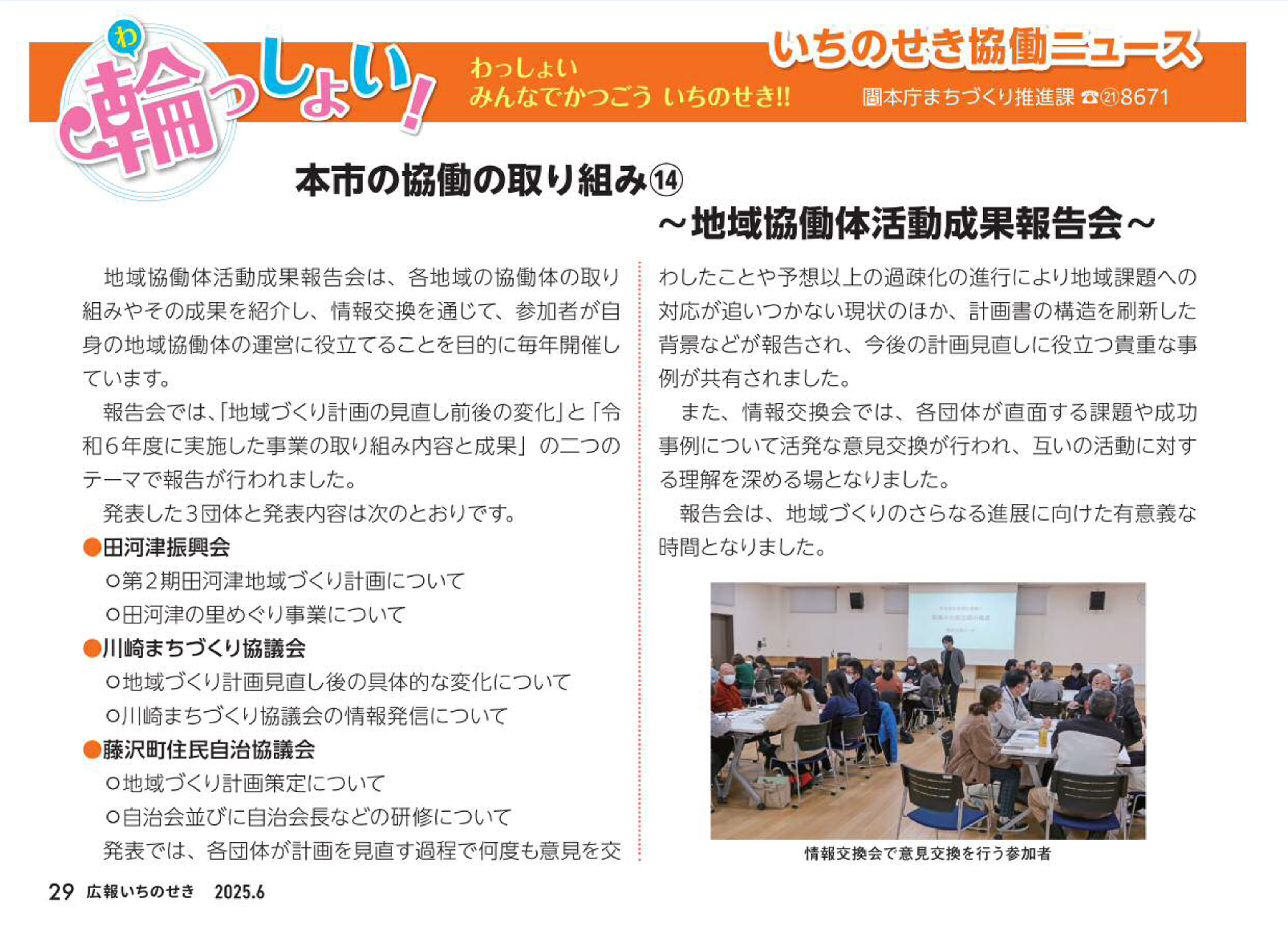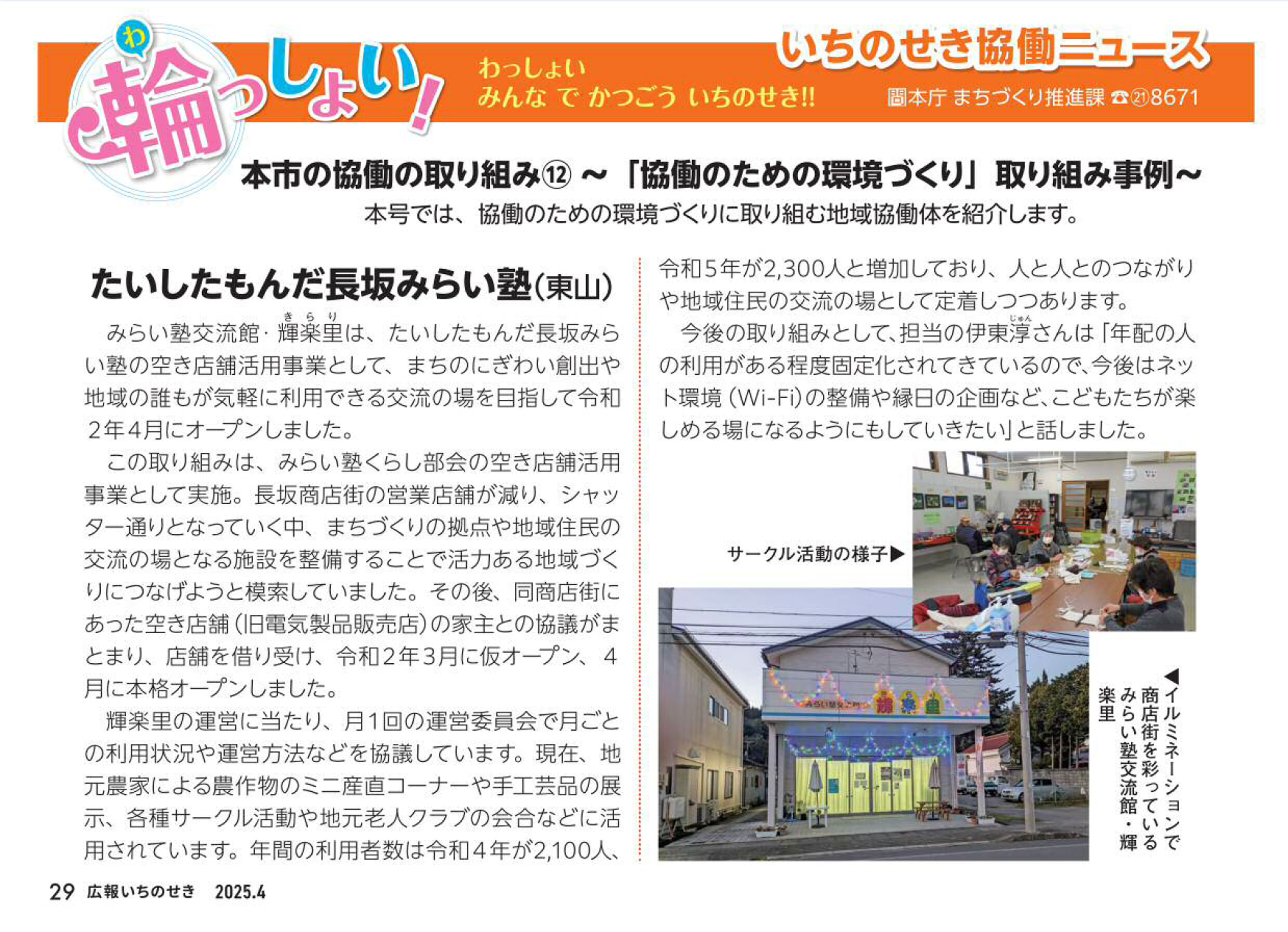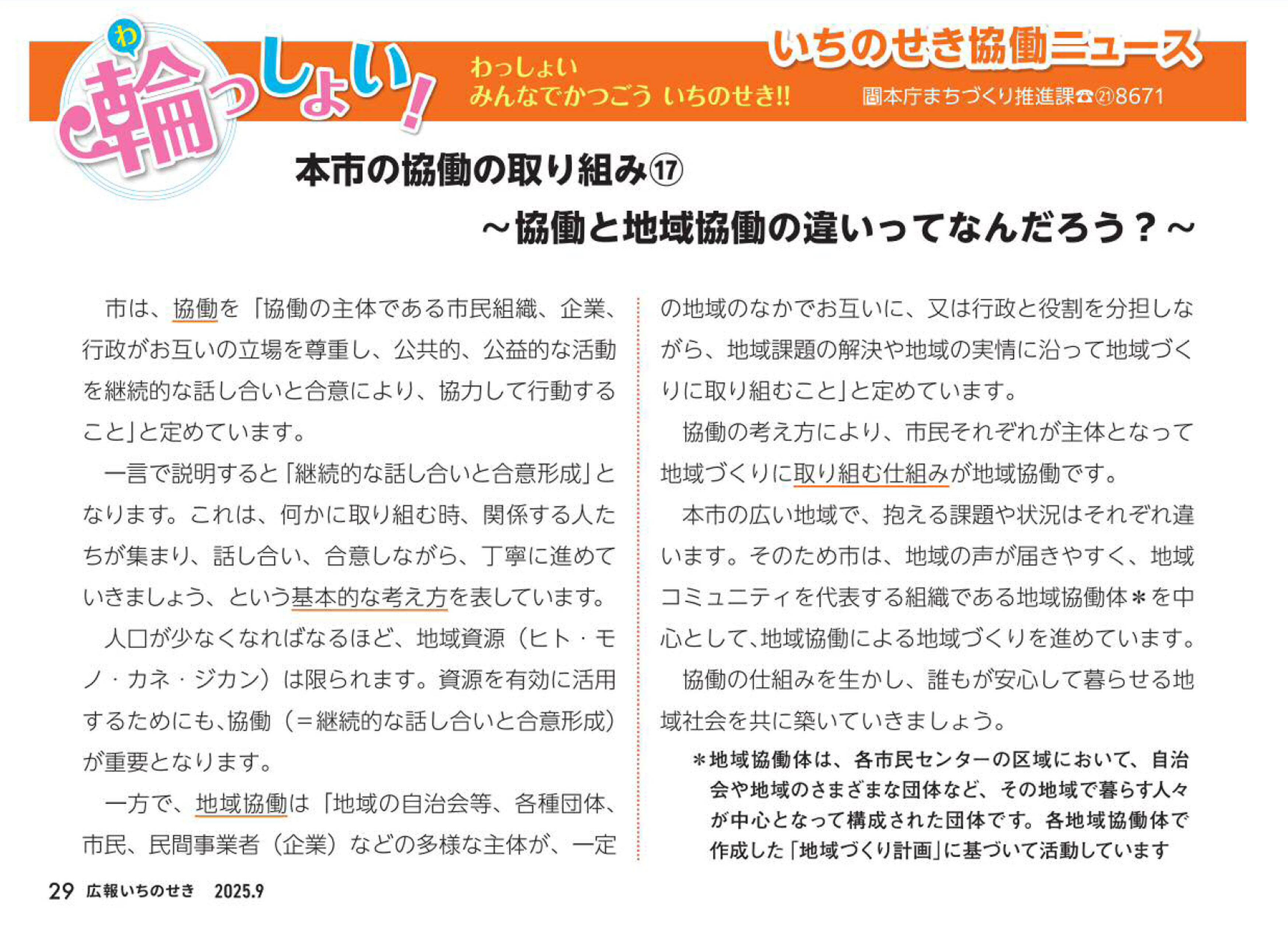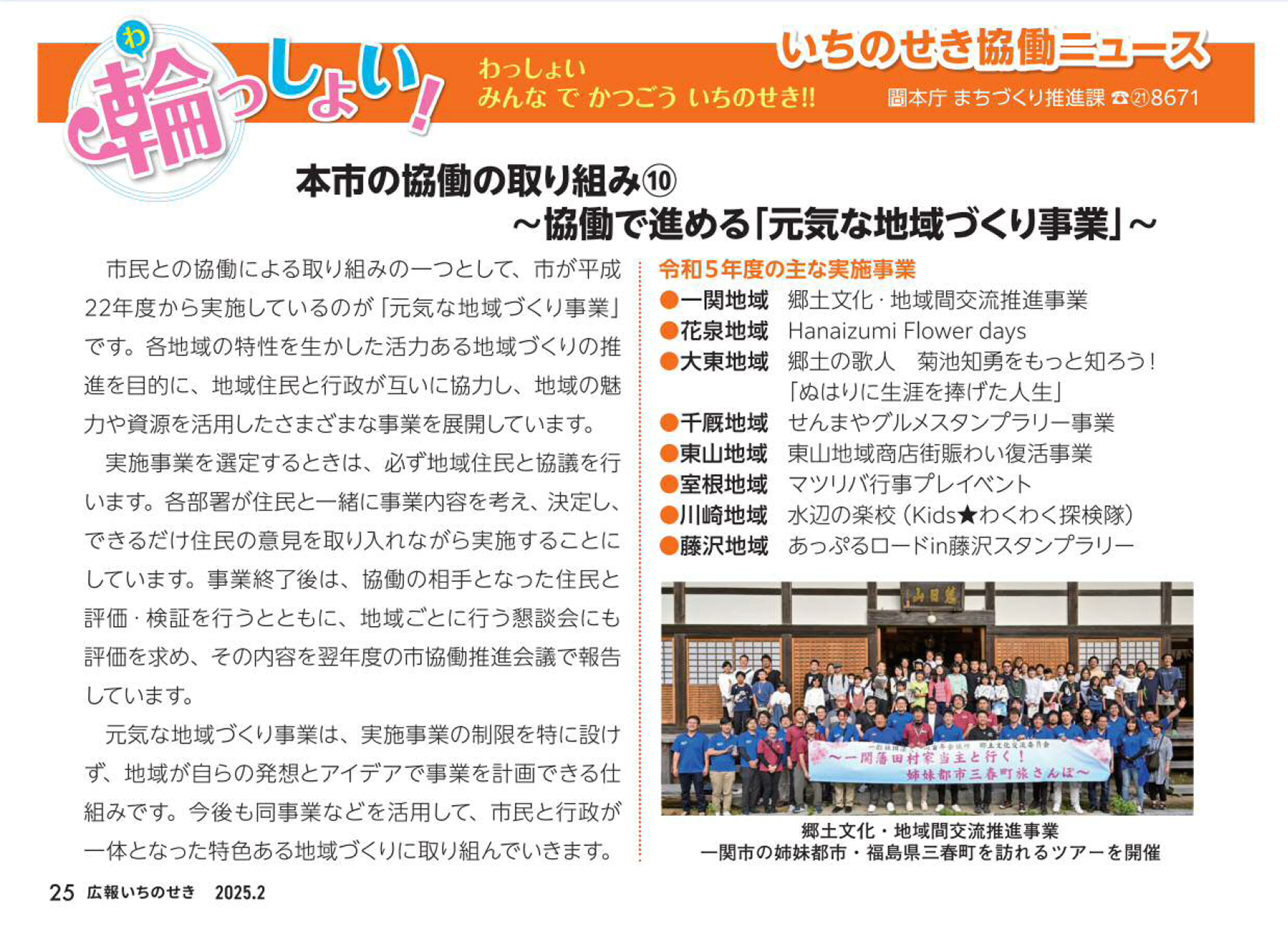 一関市は、市民の皆さんに「協働」について理解を深めていただくため、いちのせき協働ニュース「輪(わ)っしょい!」を発行し、協働のまちづくりに向けた地域の様々な取り組みを発信しています。こちらから過去の協働ニュースをご覧になれます。