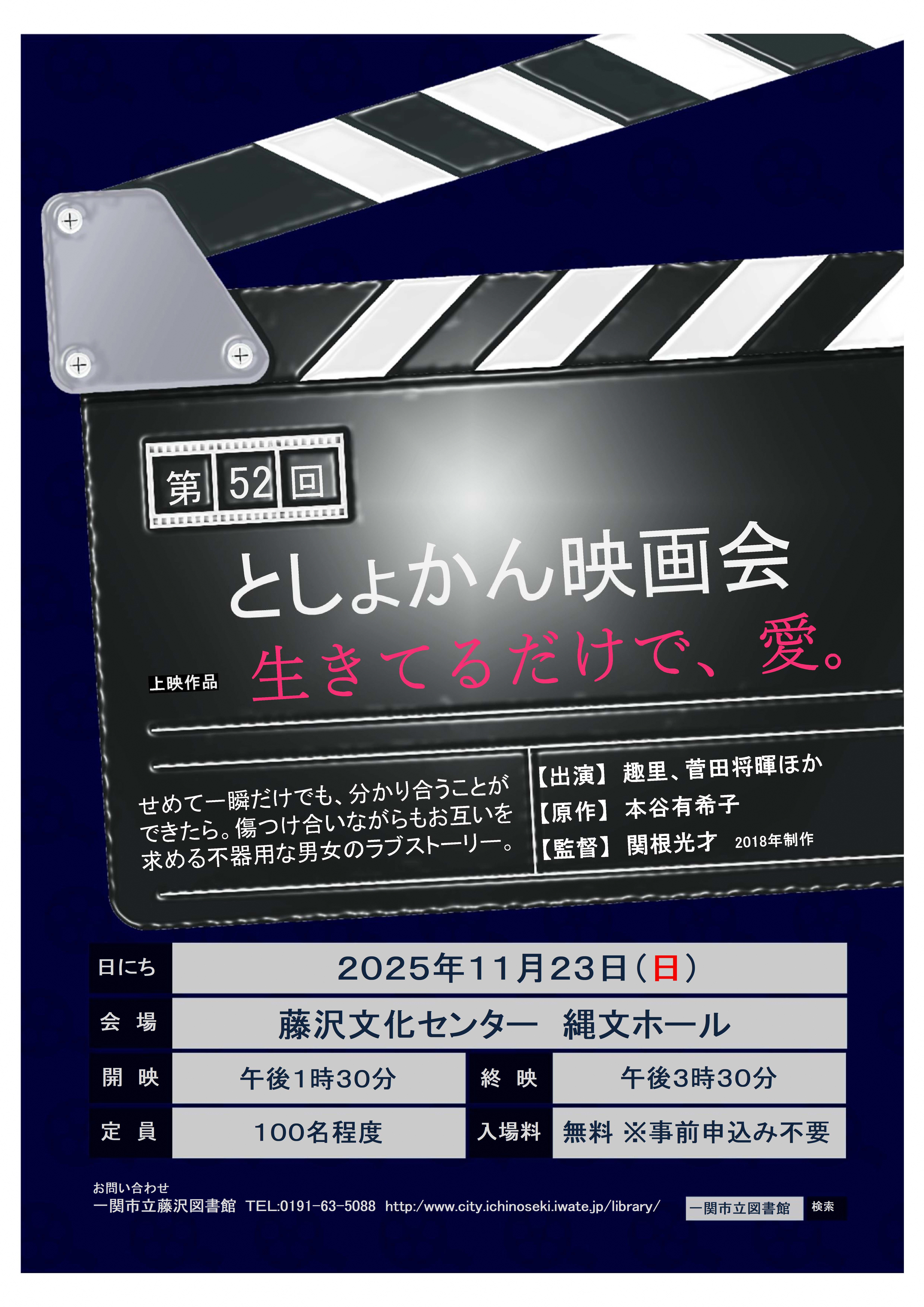 中学生以上を対象とした映画の上映会 内容「生きてるだけで、愛。」 出演:趣里、菅田将暉ほか 費用:無料 ※事前申込み不要 どうぞお気軽にご参加ください。 |