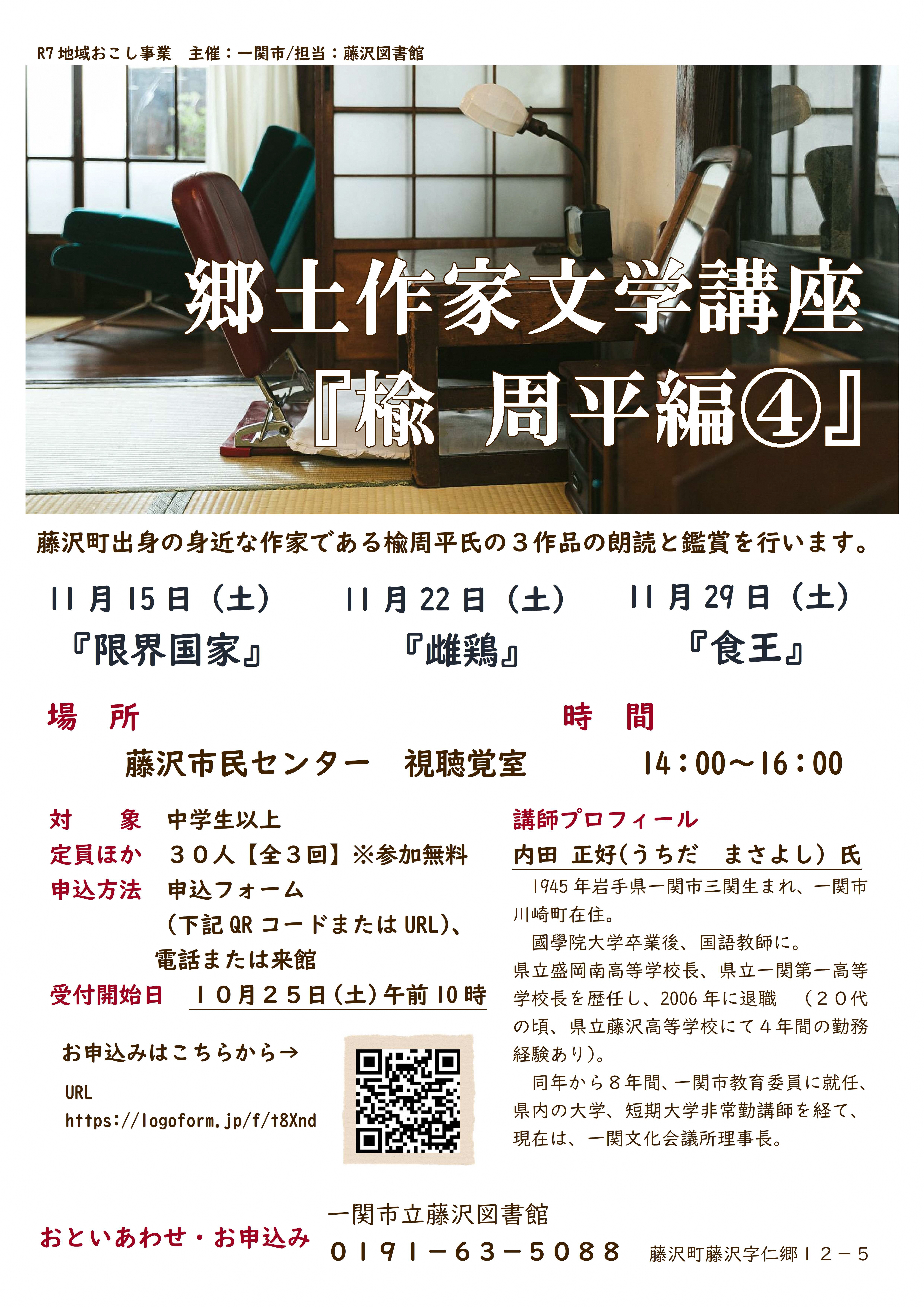 | 11月15日 | 郷土作家文学講座楡周平編④ | 藤沢市民センター視聴覚室 14時~16時 |