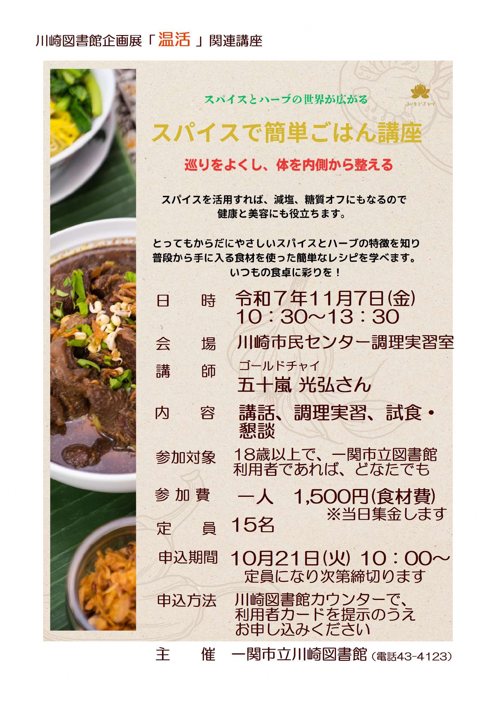 | 11月7日 | スパイスで簡単ごはん講座 | 時間:午前10時半~午後1時半 場所:川崎市民センター 調理実習室 |