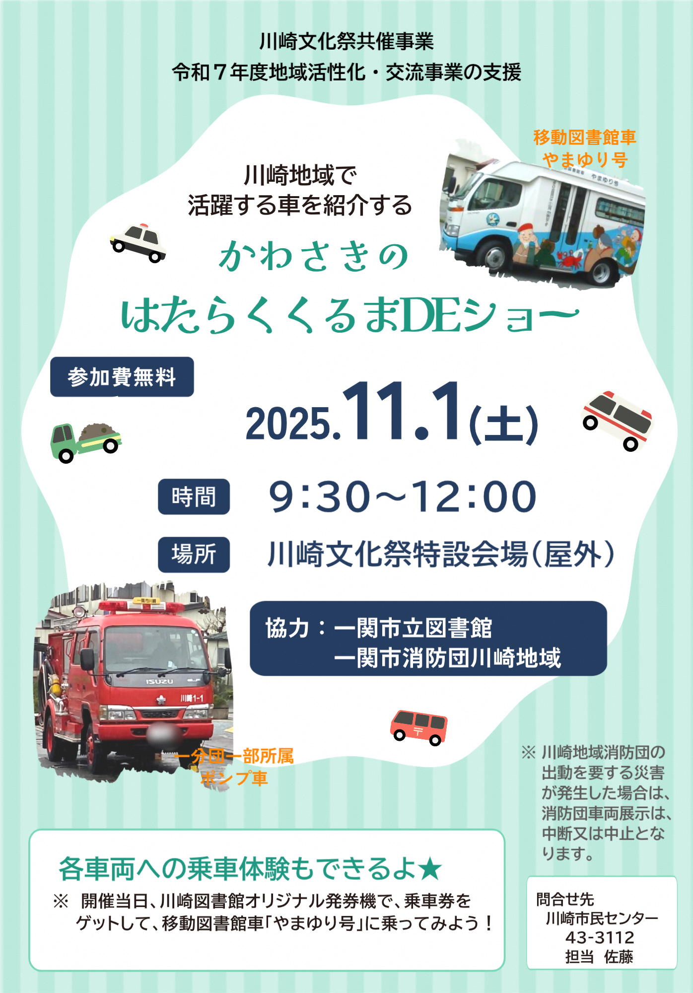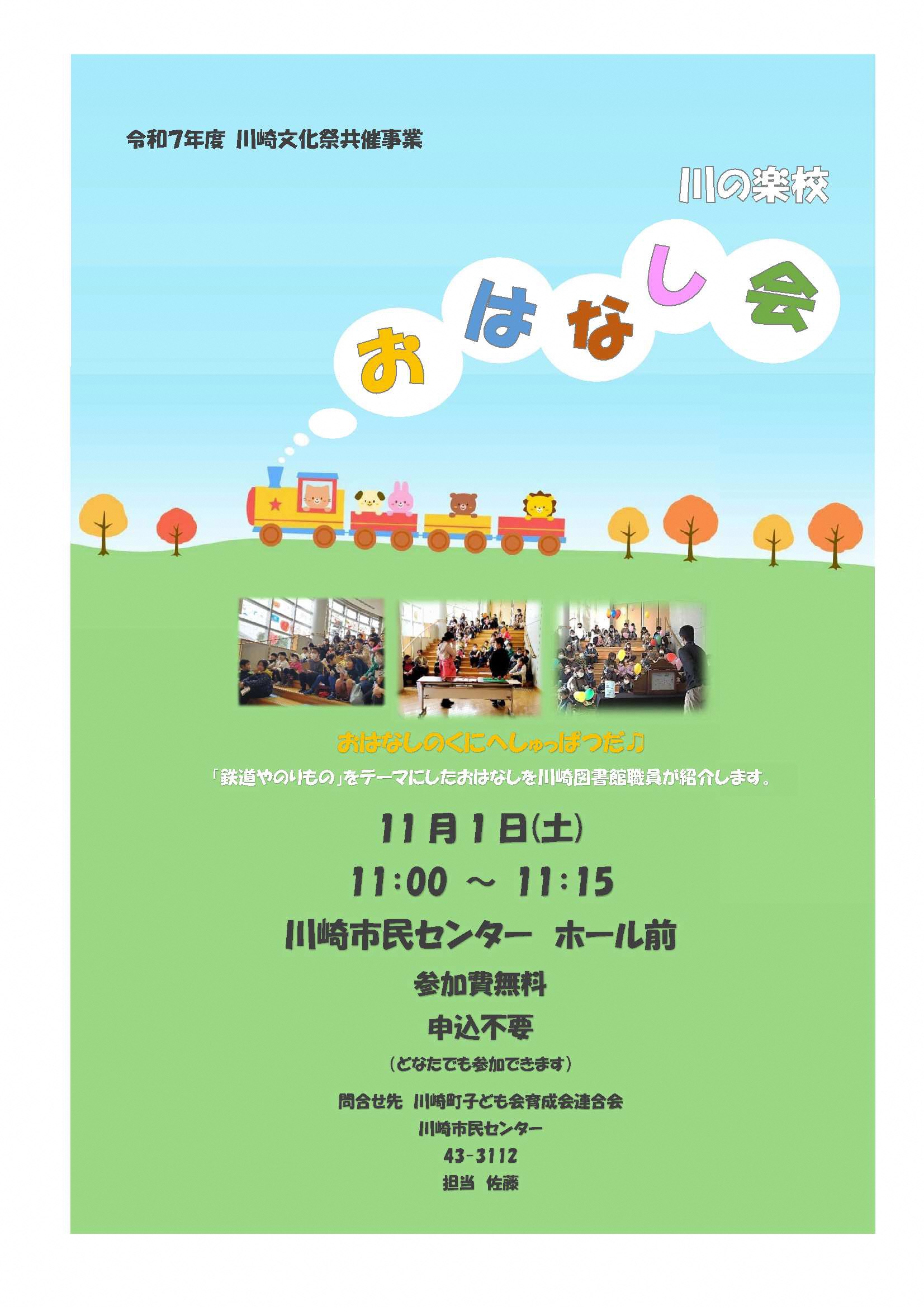 | 11月1日 | 川崎文化祭図書館イベント | 川崎市民センター | ●「川の楽校おはなし会」 午前11時00分~午前11時15分 川崎市民センター ホール前階段 ●移動図書館車「やまゆり号」体験会 午前9時30分~正午(予定) 川崎市民センター 駐車場 |