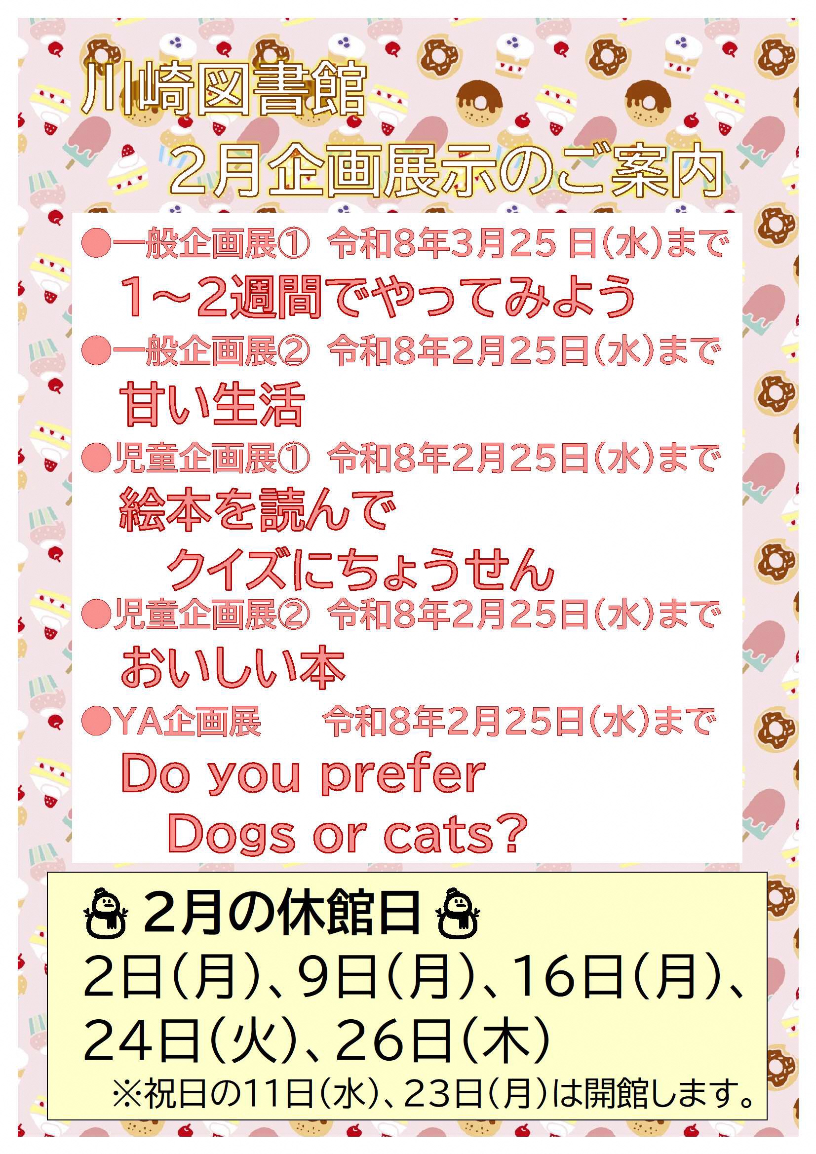 | 1月23日 | 企画展示 | 川崎図書館内 | ●一般展示①(~R8/3/25) 「1~2週間でやってみよう」 ●一般展示②(~R8/2/25) 「甘い生活」 ●児童展示①(~R2/2/25) 「絵本を読んでクイズにちょうせん」 ●児童展示②(~R8/2/25) 「おいしい本」 ●YA展示(~R8/2/25) 「Do you prefer dogs or cats?」 |