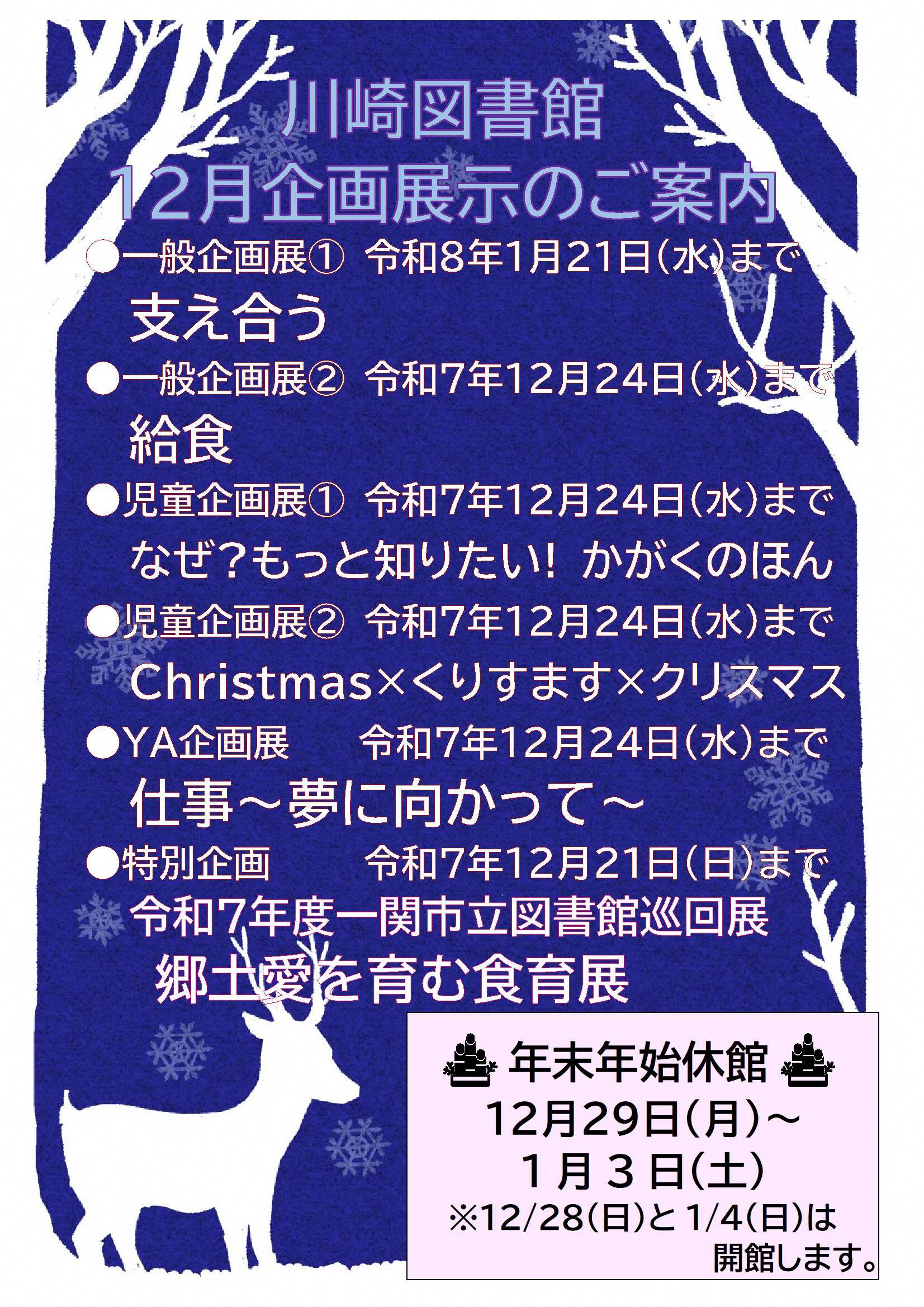 | 11月28日 | 企画展示 | 川崎図書館内 | ●一般展示①(~R8/1/21) 「支え合う」 ●一般展示②(~R7/12/24) 「給食」 ●児童展示①(~R7/12/24) 「なぜ?もっと知りたい! かがくのほん」 ●児童展示②(~R7/12/24) 「Christmas×くりすます× クリスマス」 ●YA展示(~R7/12/24) 「仕事~夢に向かって~」 ●特別展示(~R7/12/21) 「令和7年度一関市立図書館巡回展 郷土愛を育む食育展」 |