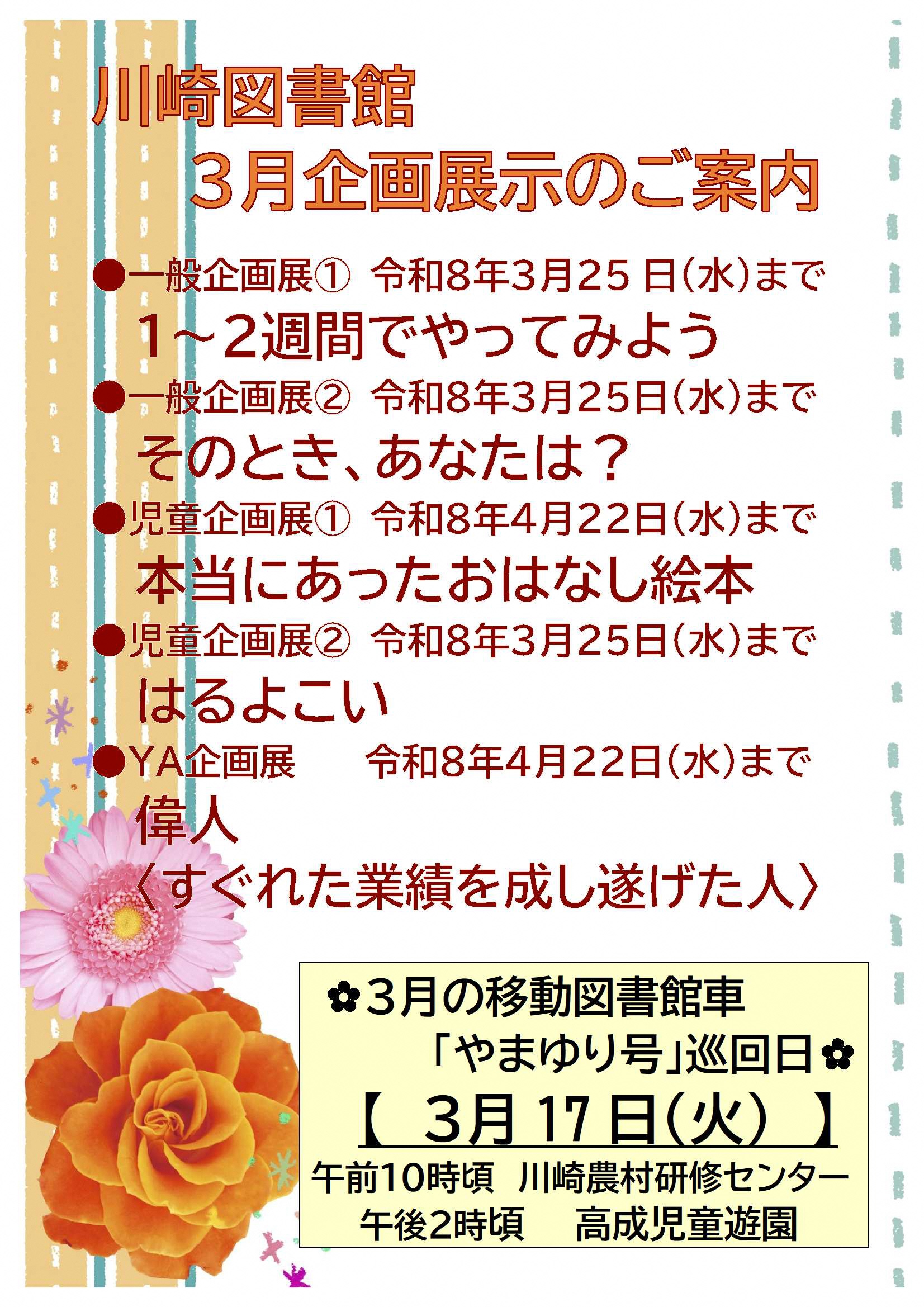 | 2月27日 | 企画展示 | 川崎図書館内 | ●一般展示①(~R8/3/25) 「1~2週間でやってみよう」 ●一般展示②(~R8/3/25) 「そのとき、あなたは?」 ●児童展示①(~R2/4/22) 「本当にあったおはなし絵本」 ●児童展示②(~R8/3/25) 「はるよこい」 ●YA展示(~R8/4/22) 「偉人〈すぐれた業績を成し遂げた人〉」 ●特別展示(~R8/3/6正午) 「雛人形展示」 |