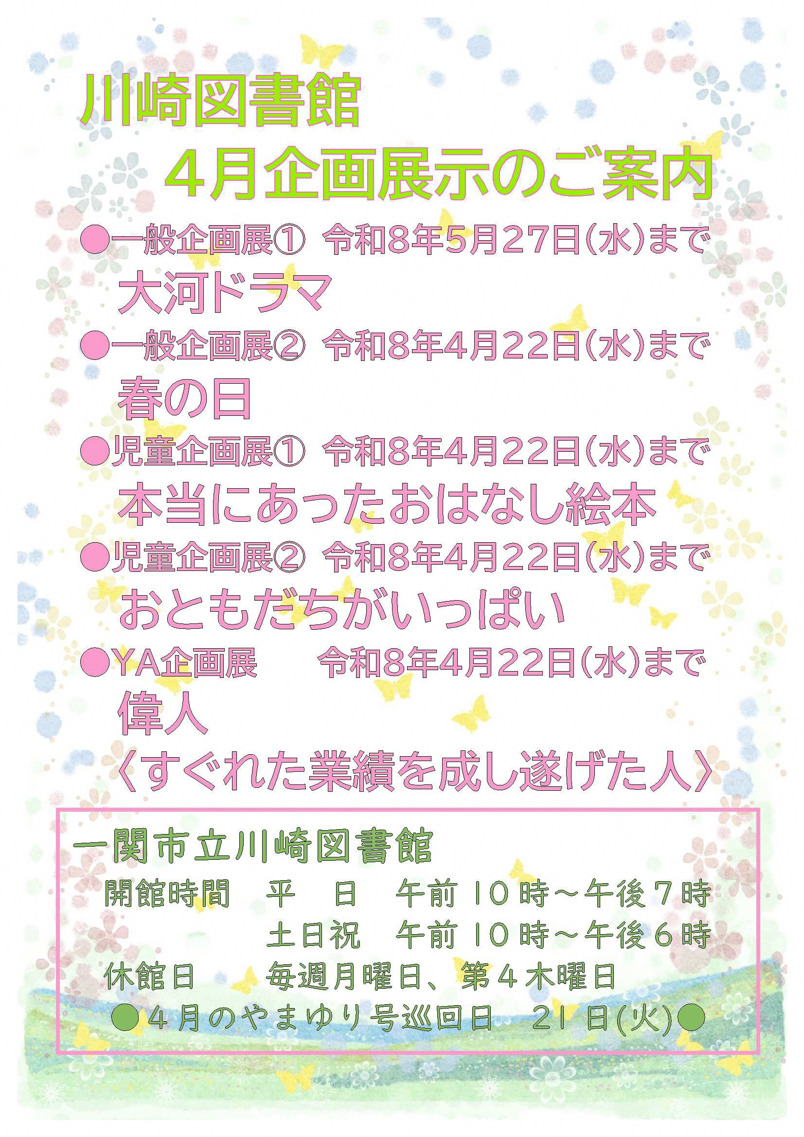 | 3月27日 | 企画展示 | 川崎図書館内 | ●一般展示①(~R8/5/27) 「大河ドラマ」 ●一般展示②(~R8/4/22) 「春の日」 ●児童展示①(~R2/4/22) 「本当にあったおはなし絵本」 ●児童展示②(~R8/4/22) 「おともだちがいっぱい」 ●YA展示(~R8/4/22) 「偉人〈すぐれた業績を成し遂げた人〉」 |