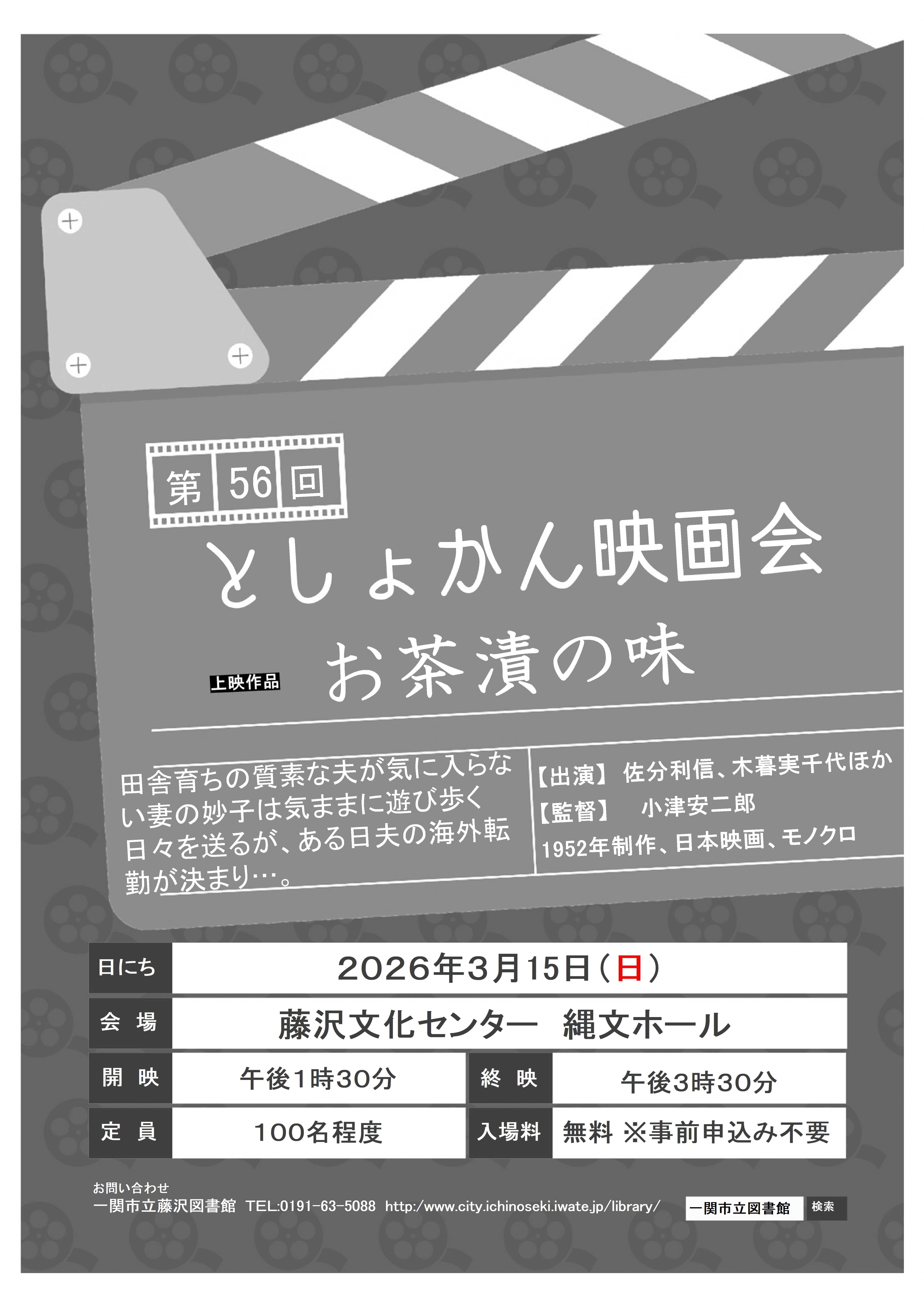 おもに中学生以上を対象とした映画の上映会 内容「お茶漬の味」 出演:佐分利信、木暮実千代ほか 監督:小津安二郎 費用:無料 ※事前申込み不要 どうぞお気軽にご参加ください。 |