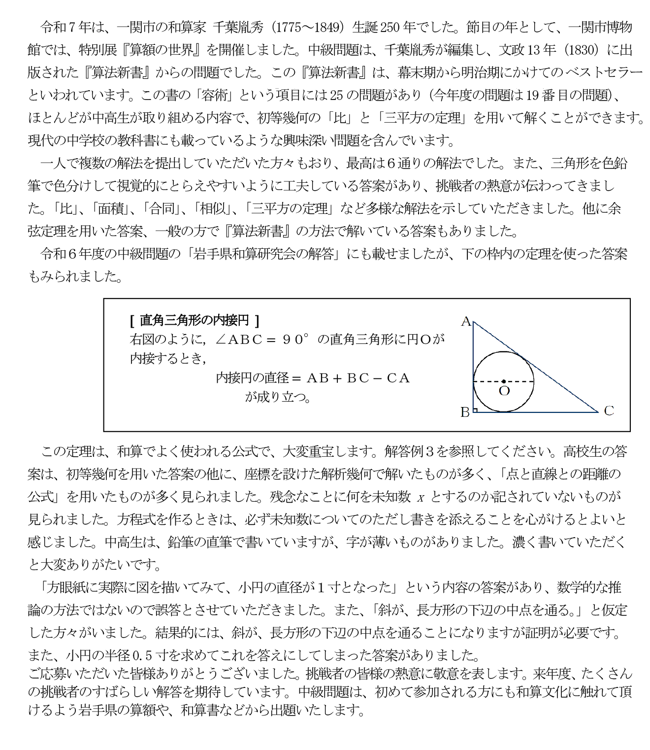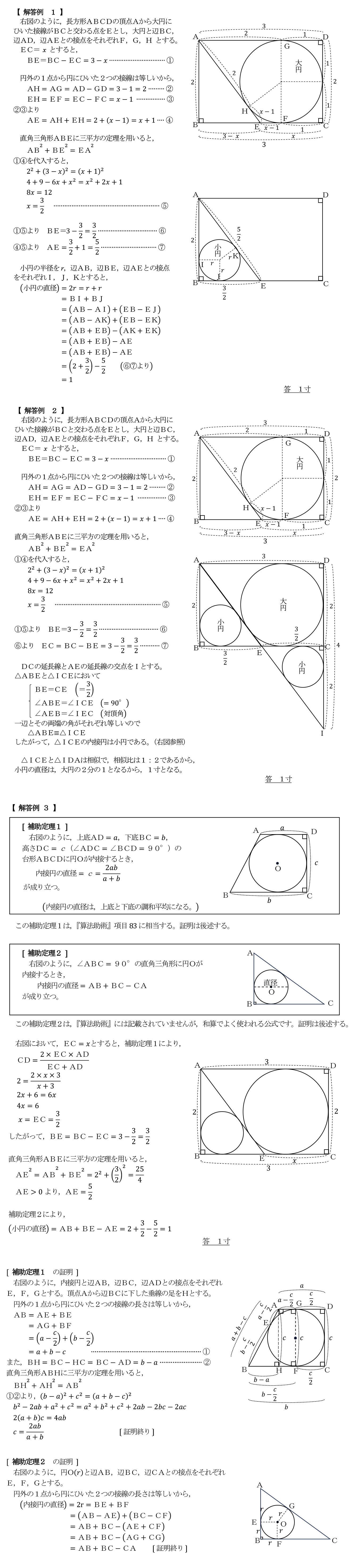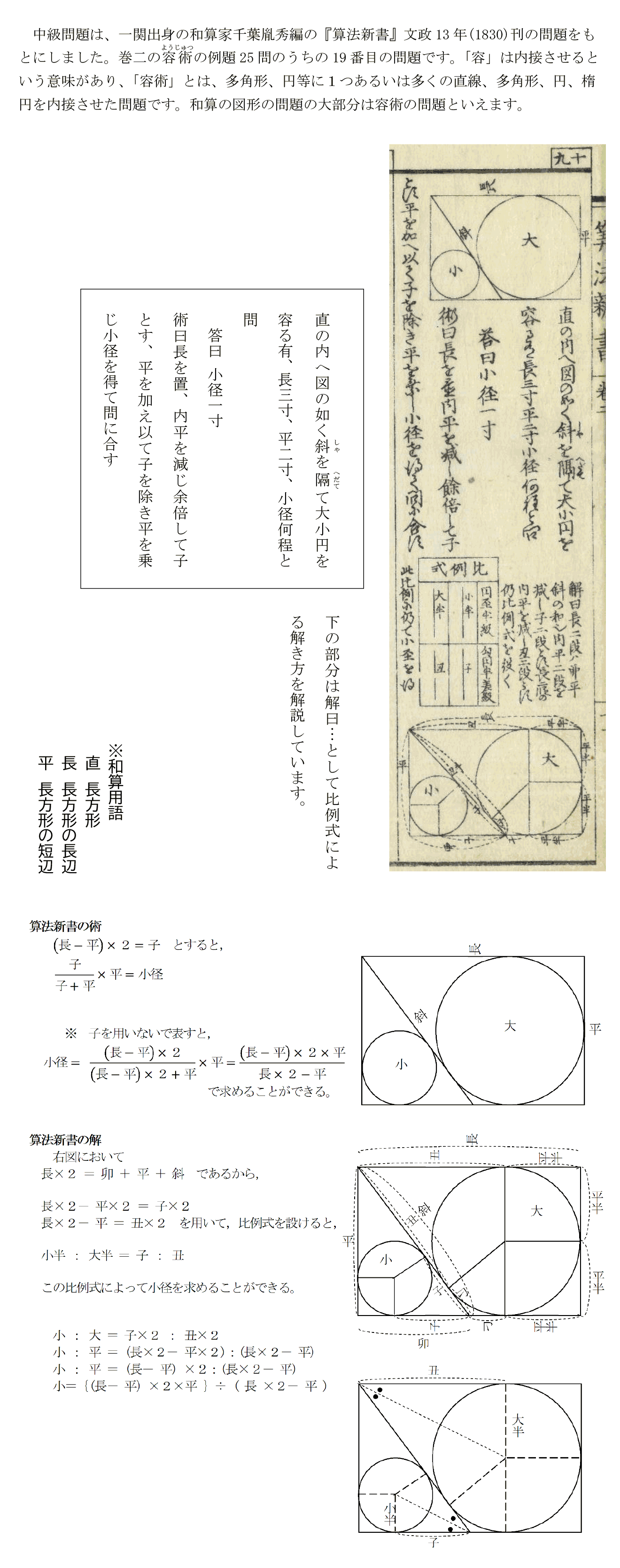 ・『算法新書』文政13年(1830)刊の問題をもとにしました。 図のように、長方形内に「斜」を隔てて大円と小円が内接しています。長方形の縦が2寸、横が3寸のとき、小円の直径を求めなさい。